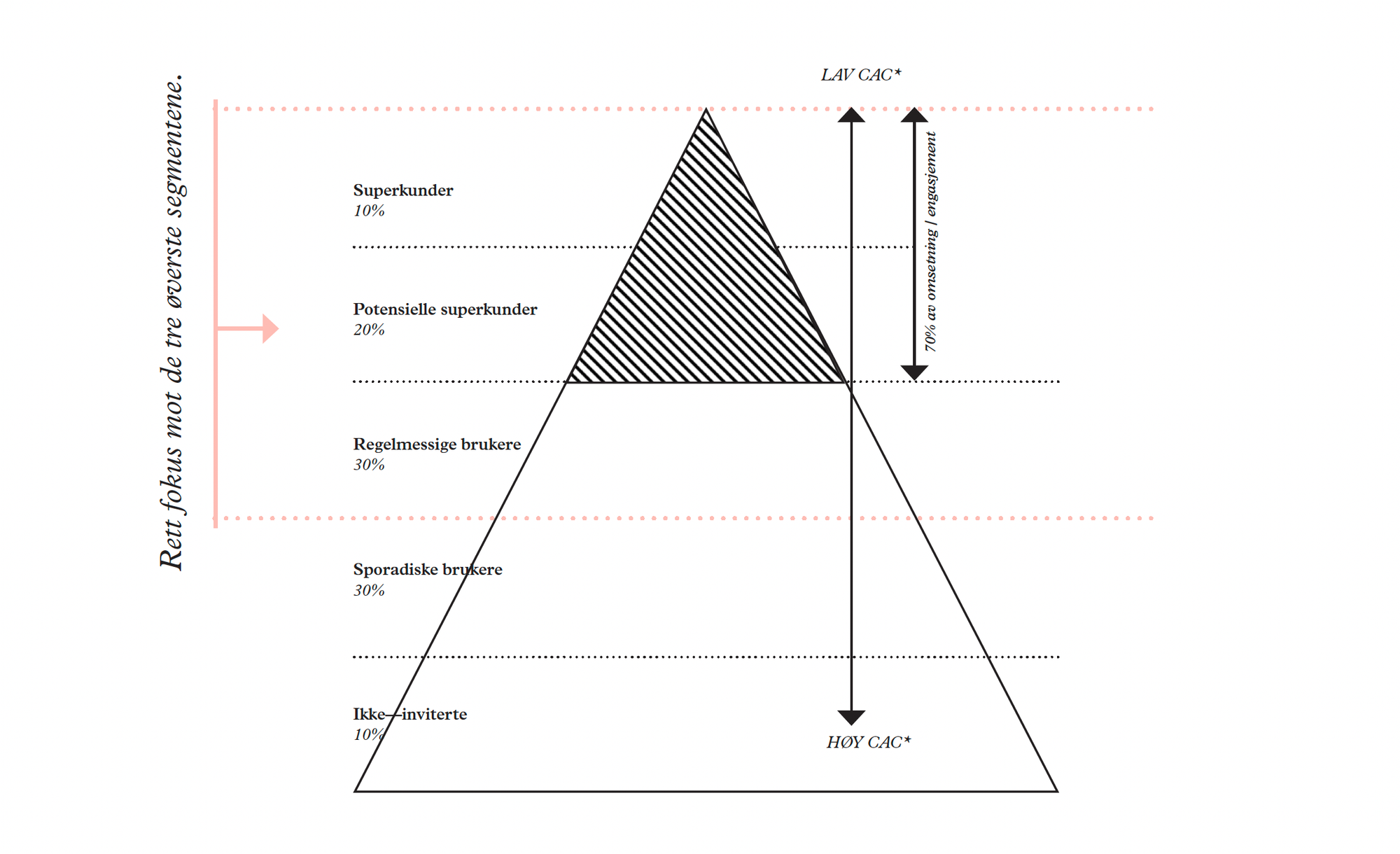 Din ressursallokering bør reflektere denne pyramiden. Bruker du mest markedsføringspenger på å konvertere folk i bunnen av pyramiden, bruker du penger som har dårlig avkastning. I stedet bør du fokusere på toppen av pyramiden. Investér i å gjøre superkunder enda mer verdifulle. Hjelp potensielle superkunder over terskelen. La de andre være.